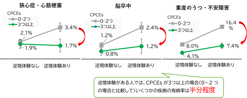 ②子ども期の地域・学校でのPCE(肯定的体験)の豊かさが、日本人ACEサバイバーの成人期疾患(狭心症・心筋梗塞、脳卒中、がん、肺疾患、重度のうつ・不安障害等)のリスクを軽減する