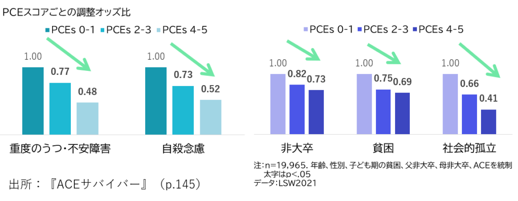 - PCEはACEの有害な影響を緩衝する(buffering)要因として機能する可能性もある(保護効果)