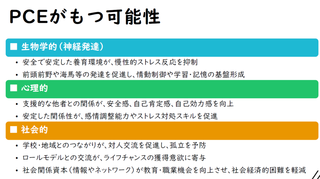 ⇒ACE予防・対策とともに、PCE支援(子どもが安心・つながり・自己価値を感じられる肯定的体験を意図的・組織的に提供する取り組み)を!